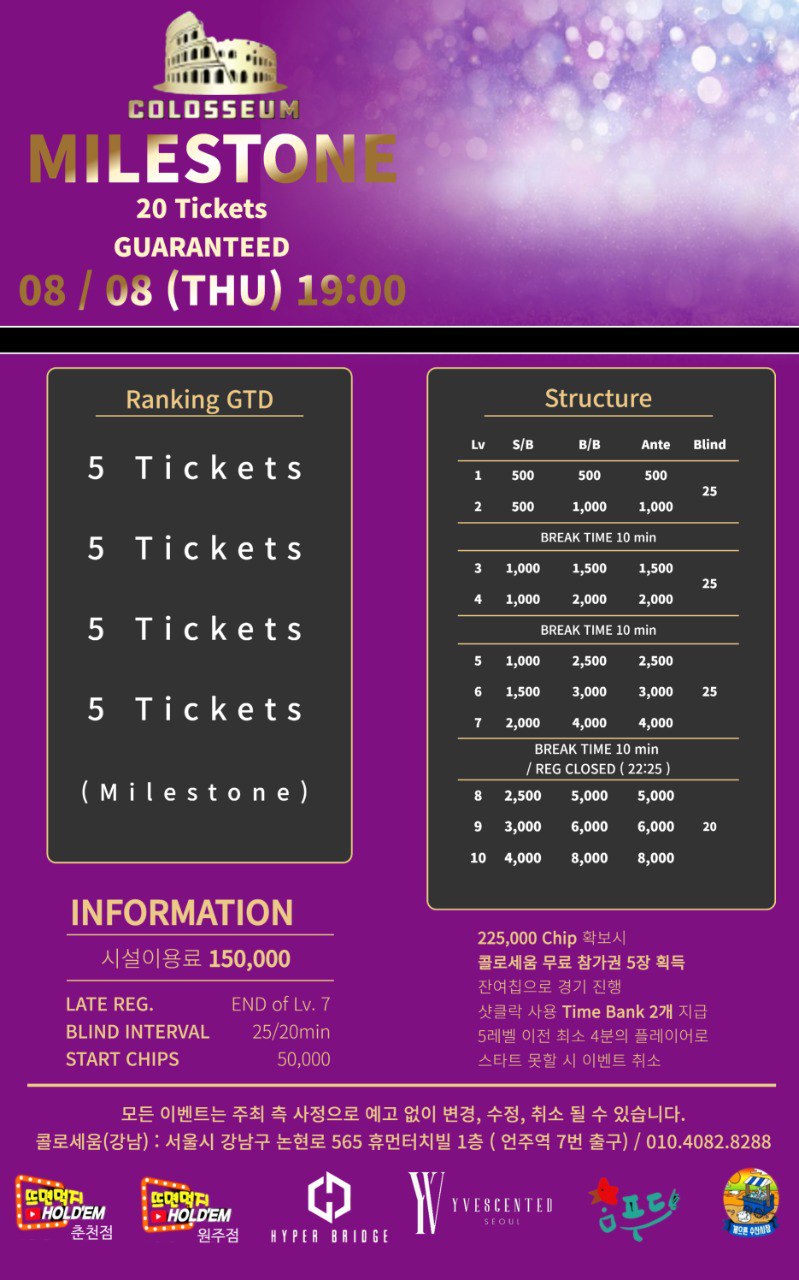 [국내 홀덤펍 토너먼트] COLOSSEUM MILESTONE 콜로세움 마일스톤 2040808 19:00