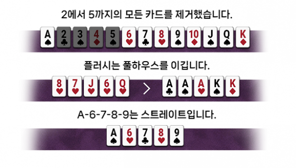 Ex) A, 6, 7, 8, 9 = 스트레이트 (여기서 A’s는 5로 사용)